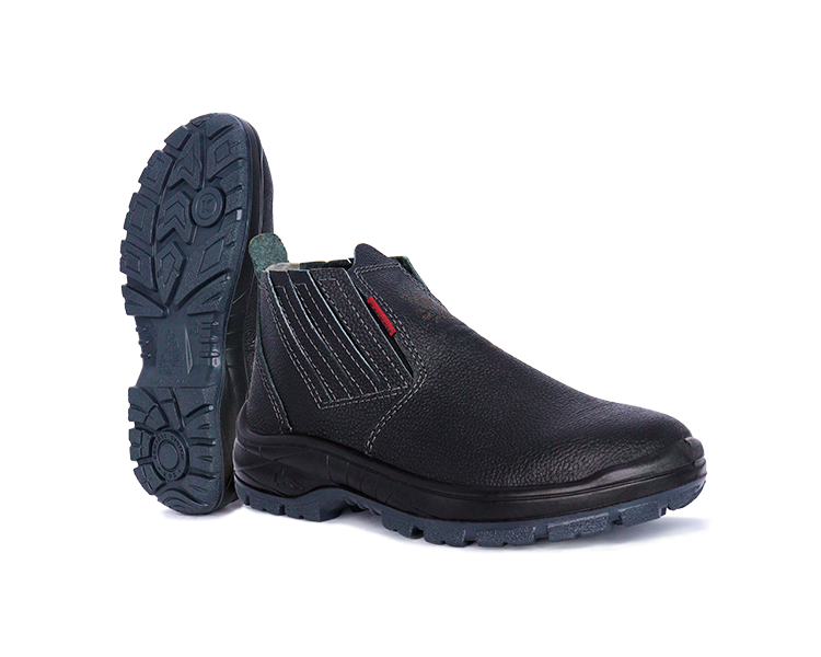 Solado em poliuretano injetado diretamente ao cabedal, bidensidade, com sistema de absorção de impactos e desenho plantar rebaixado para melhor mobilidade ao caminhar.