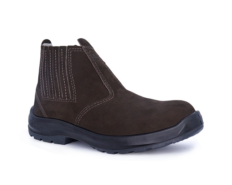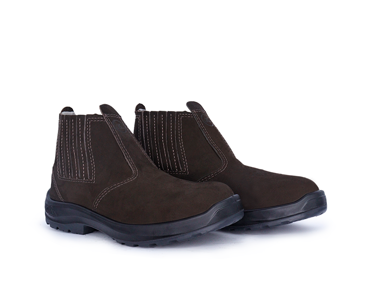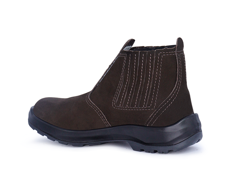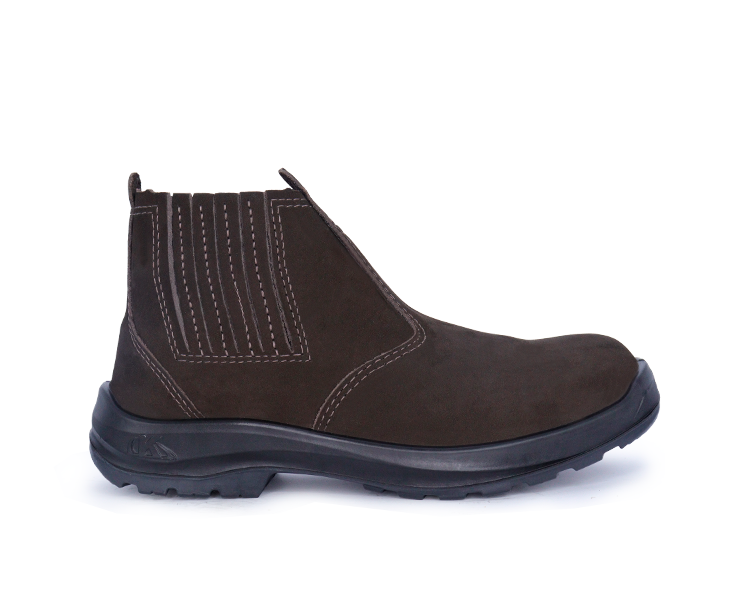 Confeccionado em couro nobuck, 1,8/2,0 mm (18/20 linhas) de espessura, com fechamento em elástico recoberto nas laterais, e costuras simples e duplas.