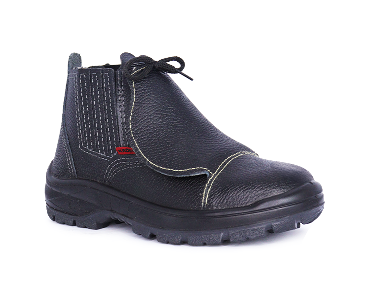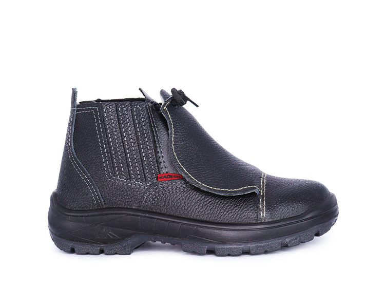 Bota de elástico Kadesh, linha Impacto, em couro groupon, preta, com protetor de metatarso externo em polipropileno (PP) e solado em poliuretano bidensidade.