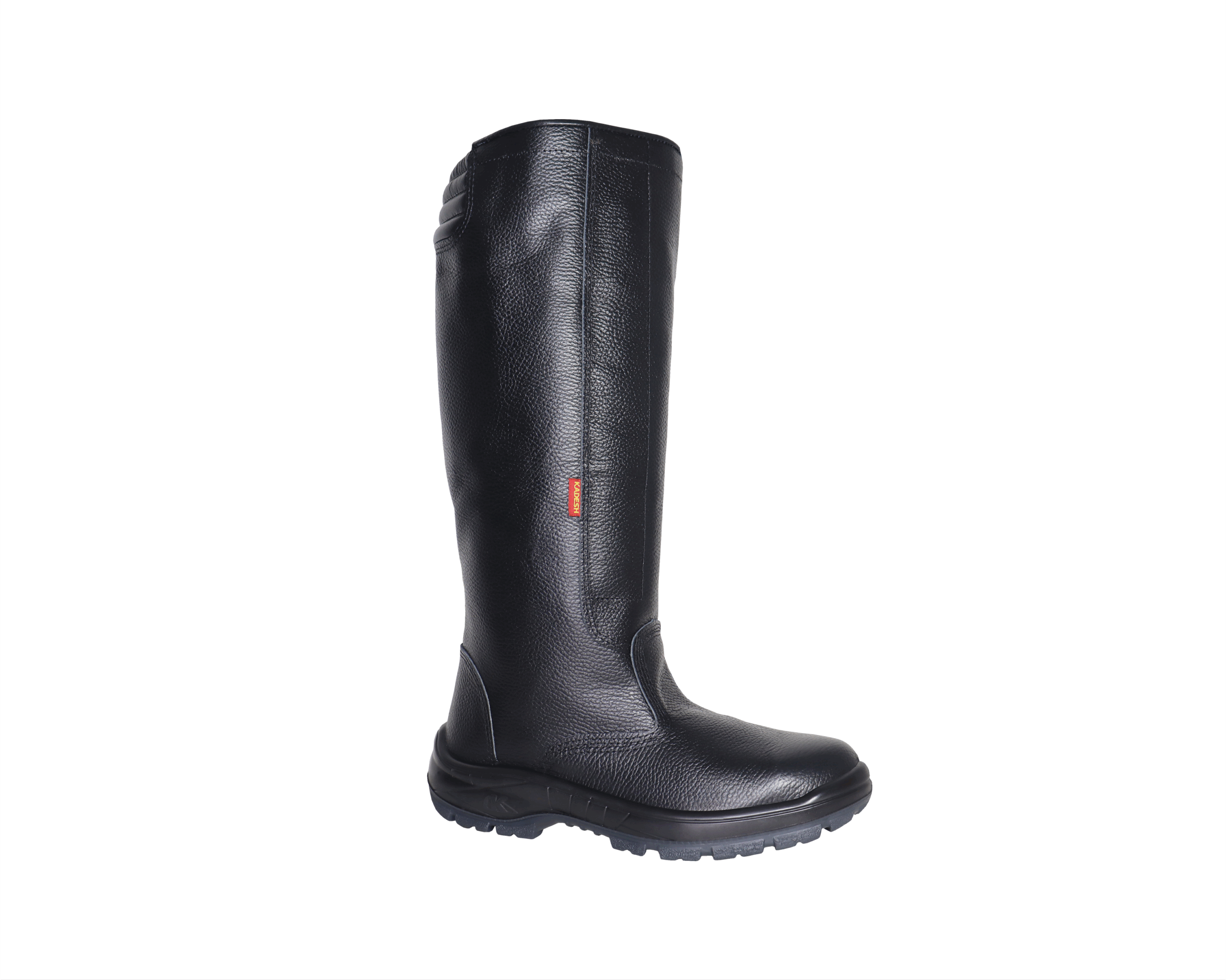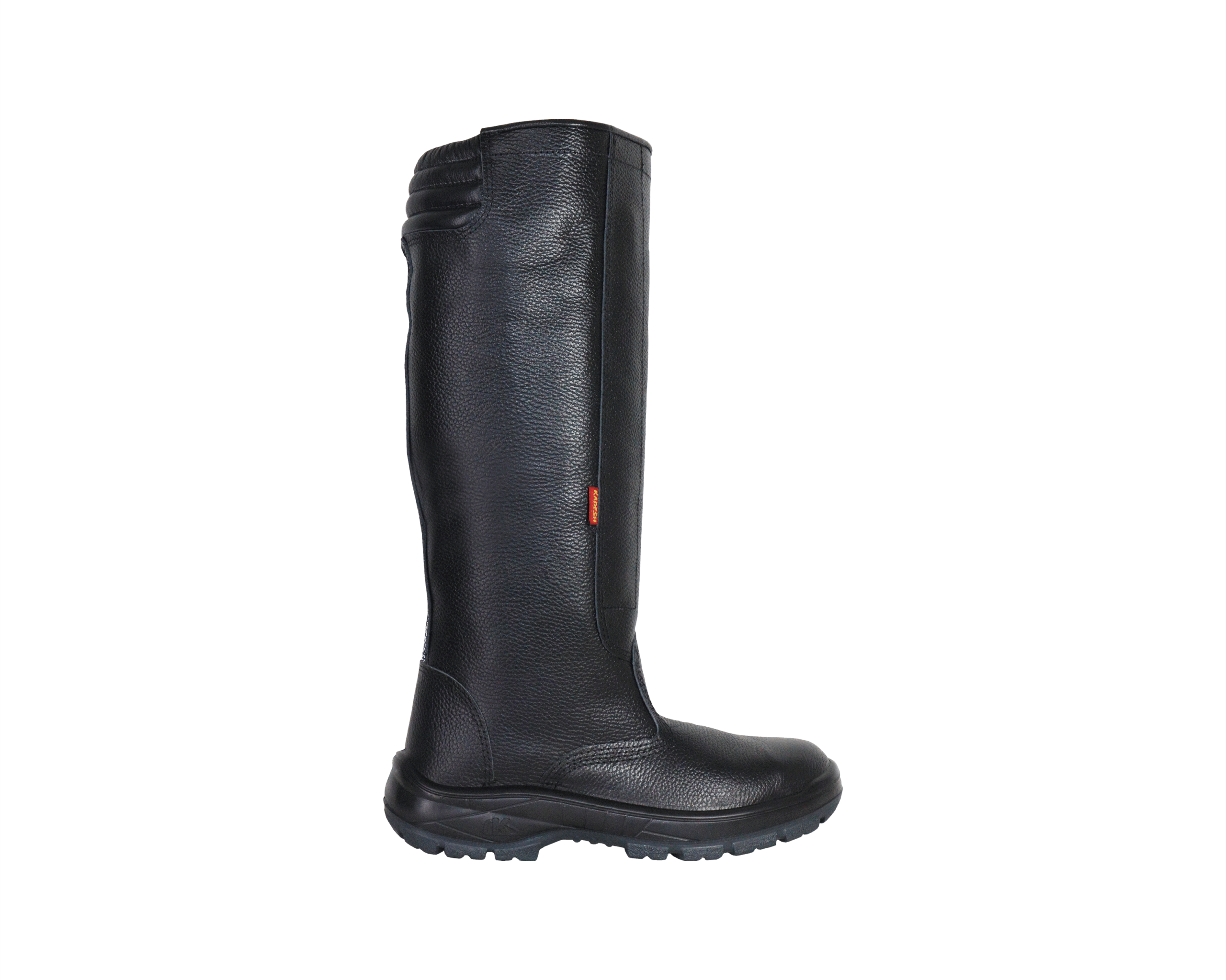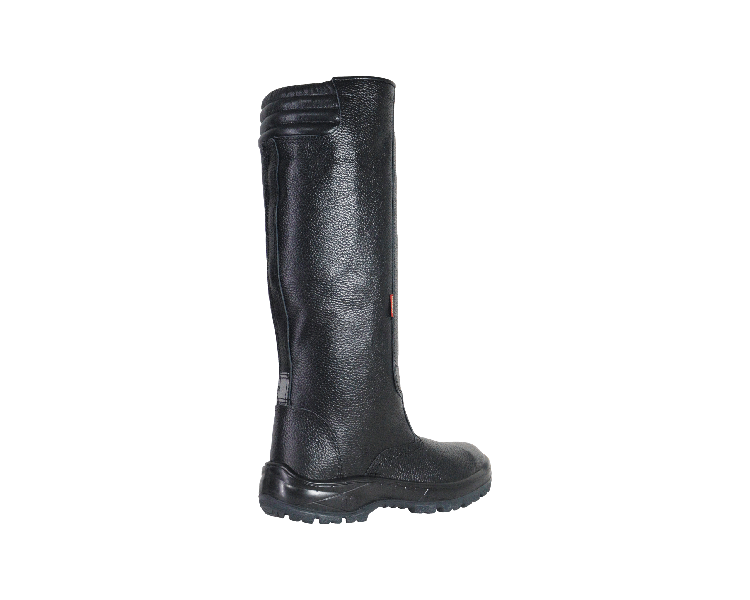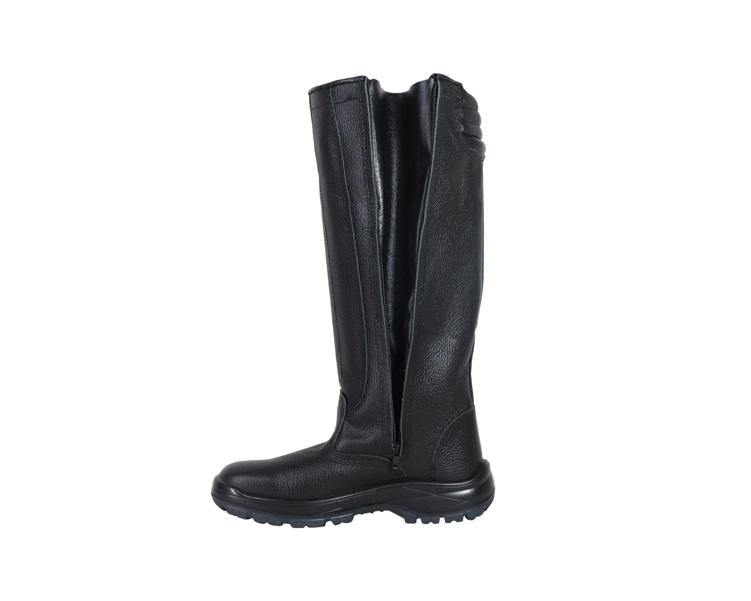 Cano tipo alto, confeccionado em couro vaqueta, 18/20 mm linhas de espessura, com protetor de tíbia, fechamento em zíper lateral em nylon/plástico, e costuras simples, duplas e quádruplas. Possui colarinho acolchoado e material refletivo na parte de trás.
